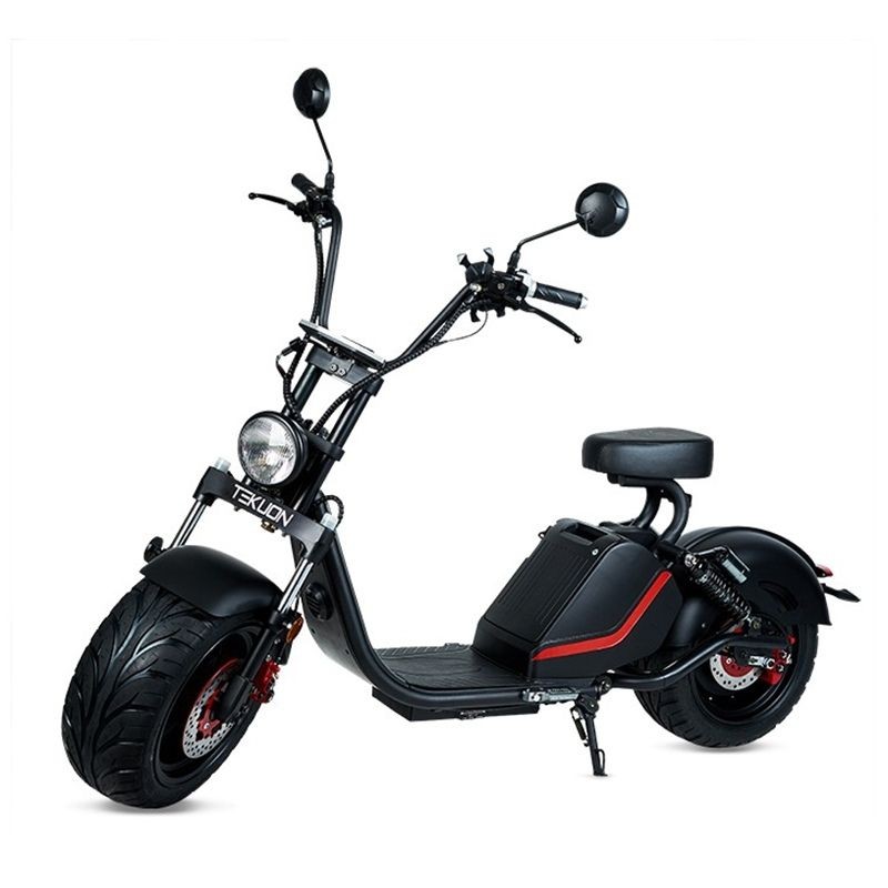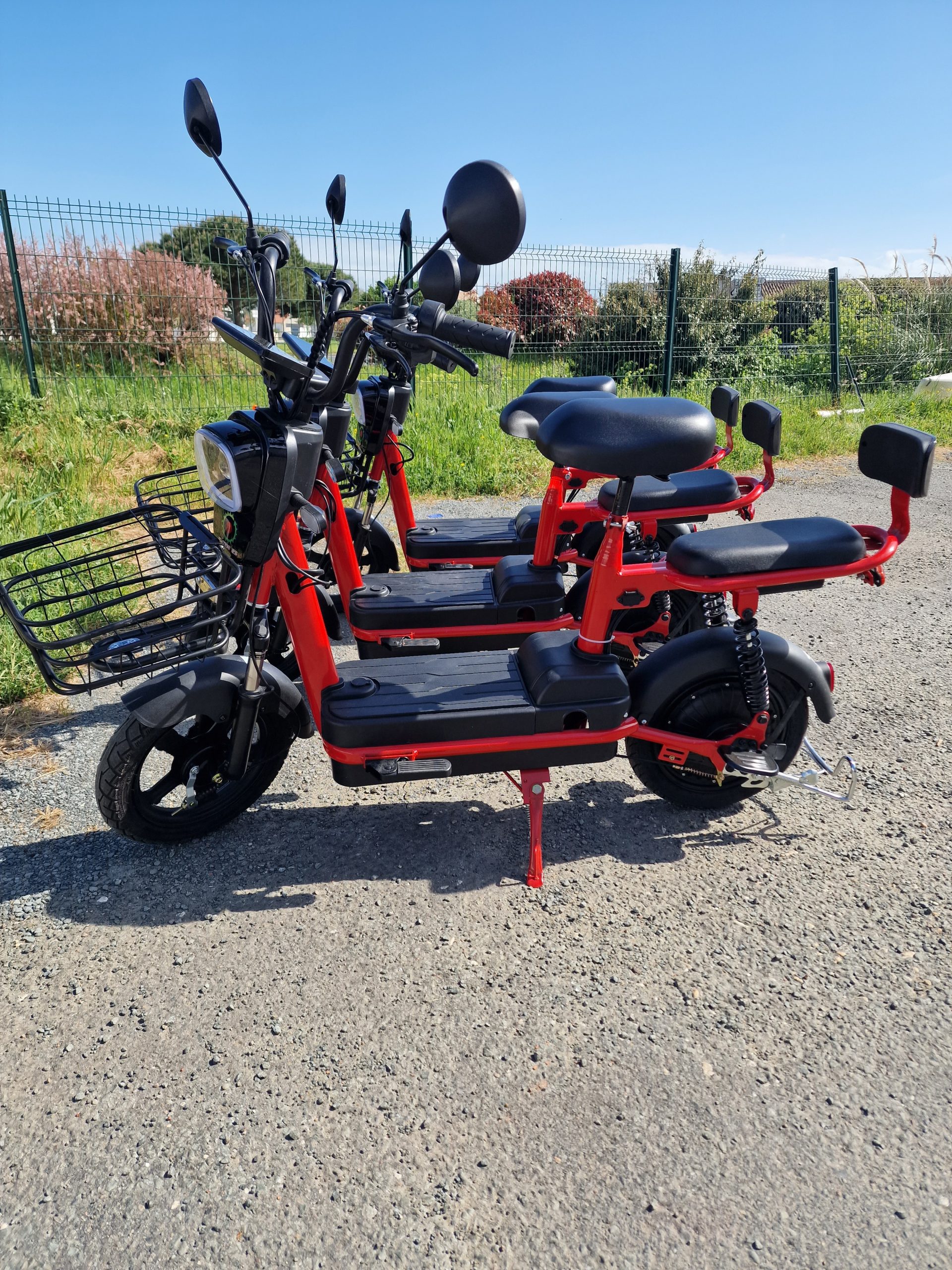 Batterie : Lithium 60V – 20Ah Amovible Vitesse : 48 km/h (en fonction du poids du conducteur, du type d’itinéraire et de la charge de la batterie) Autonomie : 60 km/h (en fonction du poids, de l’itinéraire et de la charge de la batterie) Temps de charge : 3 – 5 heures Poids maximal supporté : 150 kg Taille : 175x37x83cm Homologué route : Oui (carte grise) Nombre de place : 2 (vendu avec une selle double et une simple) 3 Vitesses, Freins hydrauliques, guidon rabattable, écran LCD XXL, rétroviseurs, feu avant, feu stop, clignotants, support téléphone avec chargeur